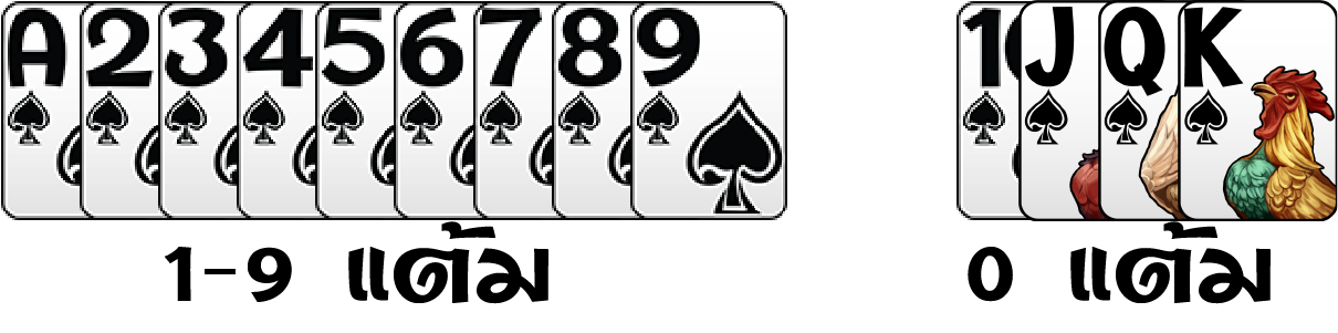ไพ่ธรรมดา จะนับแต้มตามเลขไพ่ ยกเว้น 10 J Q K จะมีเเต้ม เท่ากับ 0 แต้ม เช่น 3 Q 5 = ( 3+0+5 ) = 8 แต้ม ถ้าไพ่ แต้ม เท่ากันให้ดูที่ การเรียงเลข ถ้าเท่ากันอีก ให้ดูที่