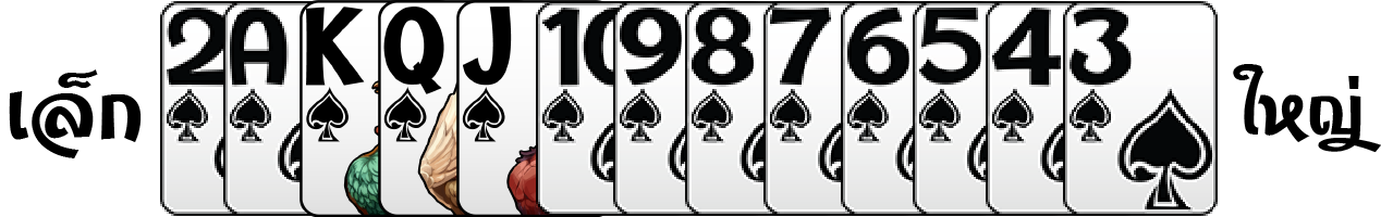 การเรียงไพ่ ลำดับการเรียงไพ่ 2 <3 < 4 < 5 < 6 < 7 < 8 < 9 < 10 < J < Q < K < A คือ A เล็กที่สุด และ 9 ใหญ่ที่สุด